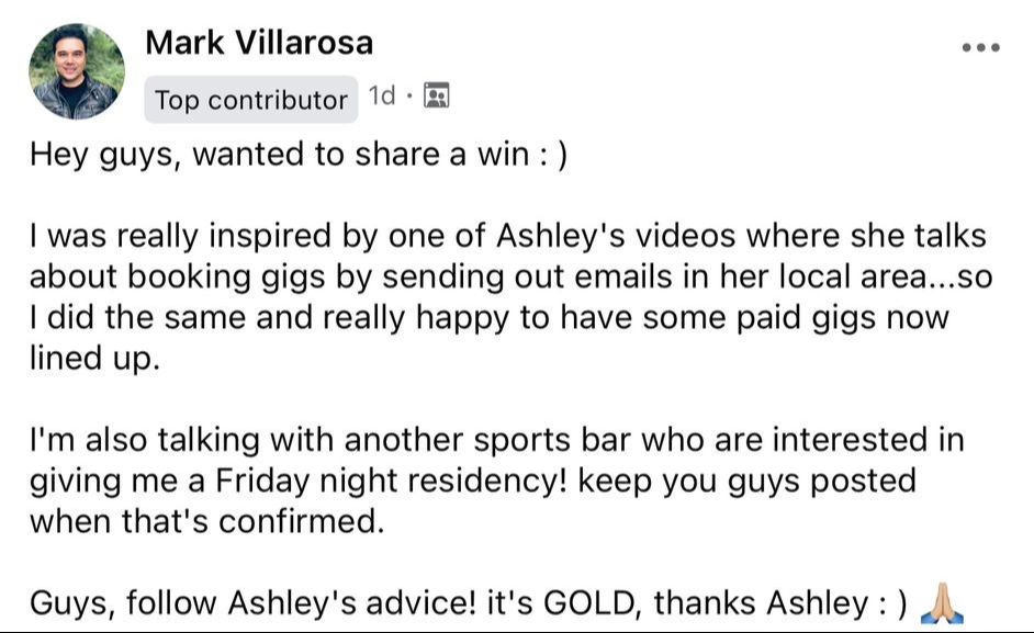 In just one session with Ashley, the course already paid for itself. This is an excellent resource for both newcomers AND those with gigging experience already.