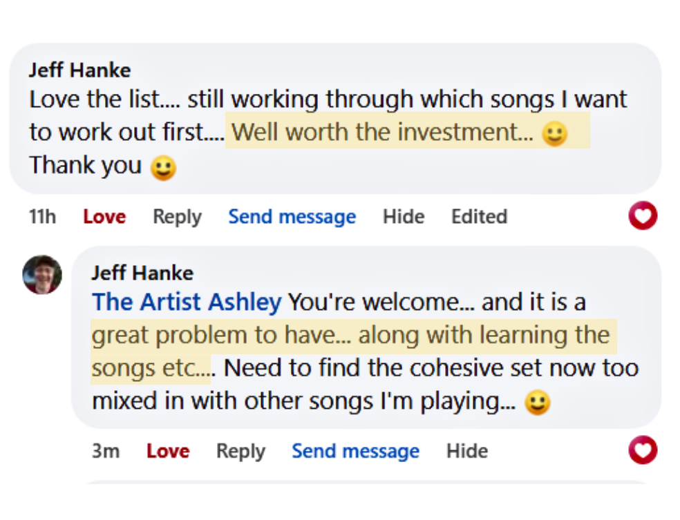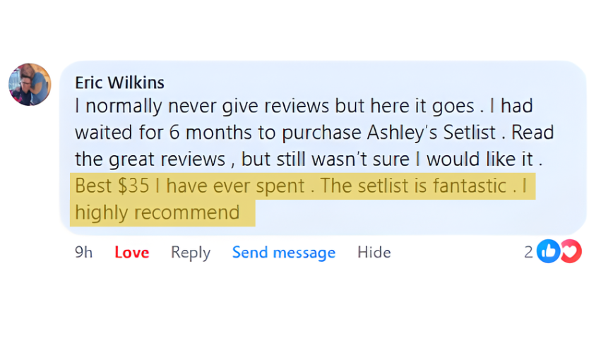 DISCLAIMER: The sales figures stated on this landing page and discussed in the Ashley's Setlist program are our personal sales figures. Please understand these results are not guaranteed. We’re not implying you’ll duplicate them (or do anything for that matter). The average person who buys “how to” information gets little to no results. We’re using these references for example purposes only. Your results will vary and depend on many factors including but not limited to your background, experience, and work ethic. All business entails risk as well as massive and consistent effort and action. If you’re not willing to accept that, please DO NOT PURCHASE Ashley's Setlist.